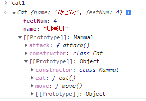 위에 보시면 알겠지만 Cat에 있는 메서드 attack, 그리고 Mammal 의 메서드 move와 eat이 Prototype Chain으로 연결되어서 사용될 수 있는 것을 볼 수 있다.