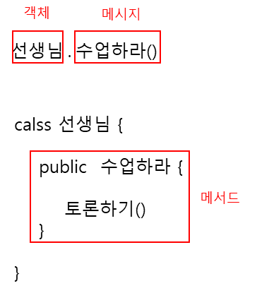 지금 까지 말했던 내용을 바타응로 객체지향 용어를 정의해보자. 객체지향에서는 선생님이나 학생을 객체라고 한다. 그리고 각각의 객체가 한 요청 (수업하라) 을 메시지라 부른다. 마지막으로 책임을 수행하는 방법(칠판 수업, 토론 수업 등)을 메서드 라 부른다.
