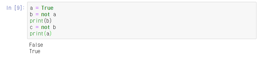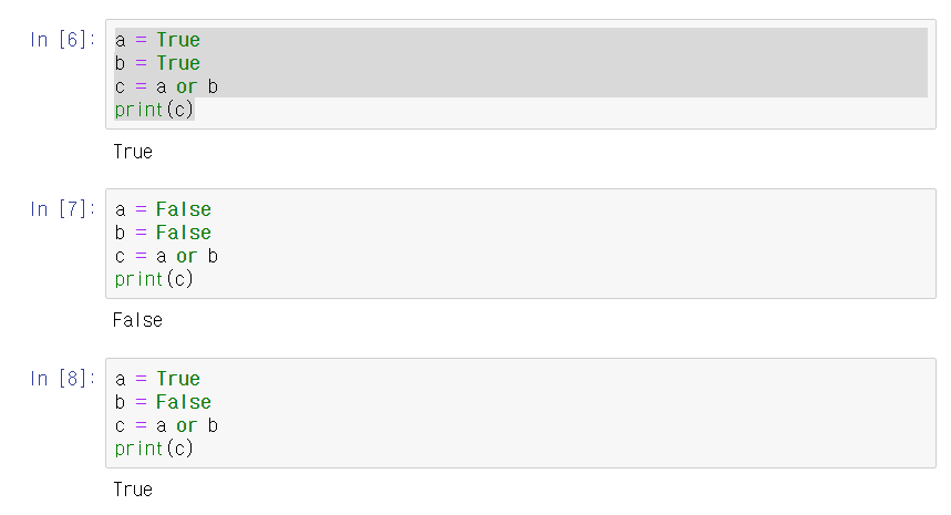 참, 거짓을 판별할 때 쓰는 boolean 타입은 True 나 False 둘 중에 하나를 가진다. 이 boolean 타입에 사용할 수 있는 연산자는 and, or, not 이 있다. 고등학교 때 수학 시간에 졸지 않았다면 아래의 예제를 이해하는데 무리가 없을 것이다. 수학시간에 충분히 잘 잔 나도 이해하니깐 말이다.