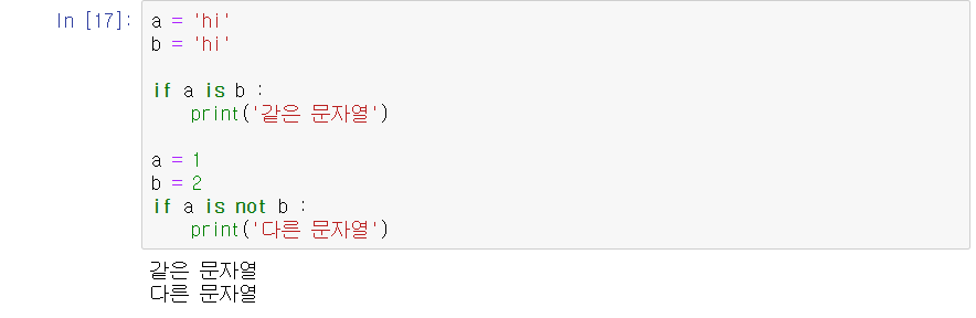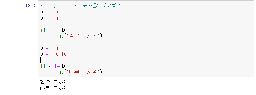 == 이나 != 같은 경우에는 java 같은 언어에서는 저걸로 문자열을 비교하면 에러가 났다. ㅎㅎ 하지만 파이썬은 == 이나 != 으로 비교하는게 가능하다.