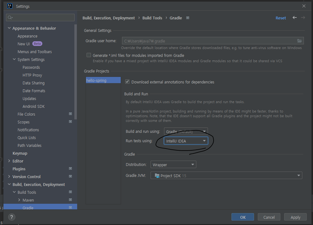 Run tests using 이 Gradle 로 되어 있는 것을 확인할 수 있다. 이걸 Intellij IDEA 로 바꿔주자.