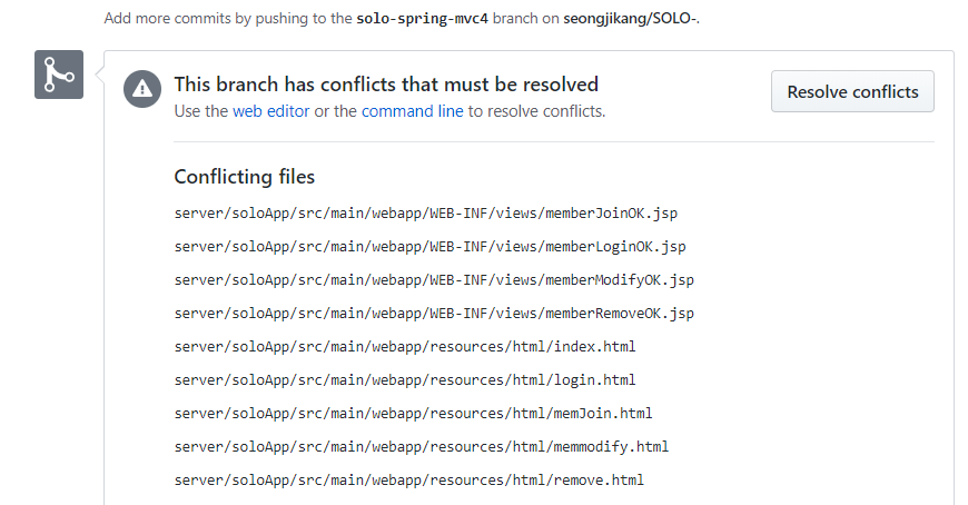 먼저 conflict가 발생한 이유에 대해서 말해봄..! 지난 글에서 보면 (https://devkingdom.tistory.com/2 ) solo-spring-mvc3 에서 브랜치를 따서 작업을 했었는데, 위의 사진을 보면 각 브랜치 사이에 마스터가 있다. 그런데 내가 이제 commit 치고 서버로 push 하고 이제 딱 master에다가 merge를 하려고하니깐 서버가 "이놈은 solo-spring-mvc3에서 브랜치를 따놓고 master에 merge 하려고 하네? " 라고 하면서 conflict를 발생시켜 버린다.