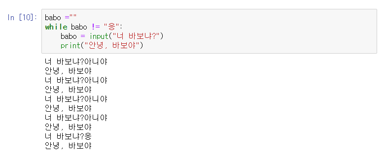 (위의 while문의 의미는 'babo 변수 값이 "응" 이 아니면 "안녕, 바보야" 출력 하라' 라는 의미임)
