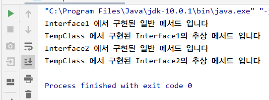TempClass를 보면 Interface1, Interface2 두개의 인터페이스가 구현되어 있는 걸 볼 수 있다. 다중상속은 이렇게 사용하면 된다. 이 소스를 실행시켜보면 ...