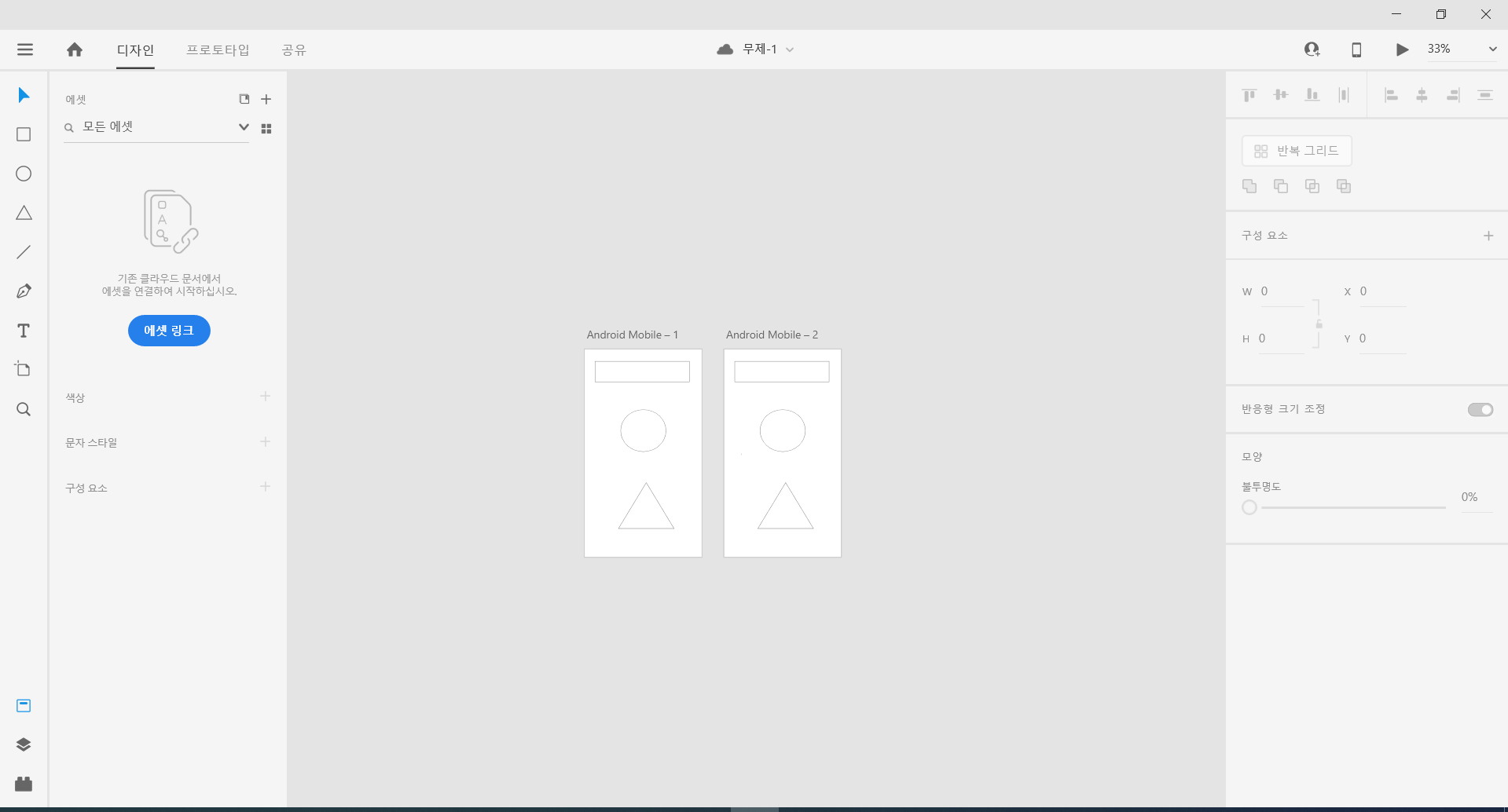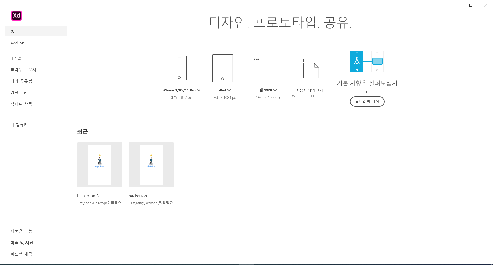 일단 Xd를 열어보면 다음과 같이 디바이스를 선택할 수 있게 나온다. 아이폰은 버전 별로 선택할 수 있지만 ㅜㅜ 안드로이드는 하나 밖에 없다 ㅜㅜ 안드로이드 개발자 분들은 사용자 정의 크기를 이용해서 원하는 크기로 맞춰서 사용하자.