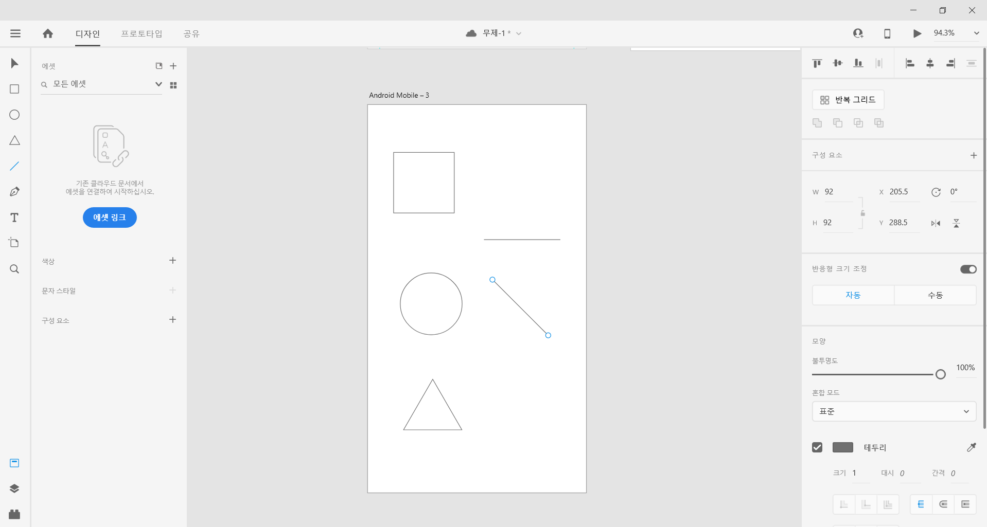 좌측에 있는 도형 아이콘을 클릭해서 하나하나 그려보자. 오늘 처음 배운 기술인 그루핑 기술