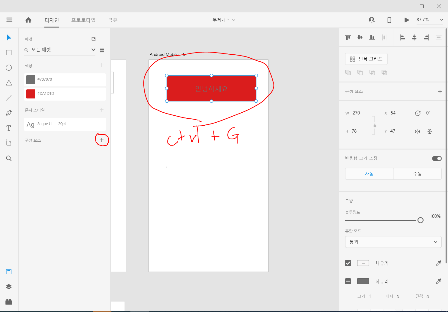 두개를 합쳐서 그룹핑해보자. 그룹핑은 지난 포스팅에서 ctrl+ G로 할수 있다고 했다.