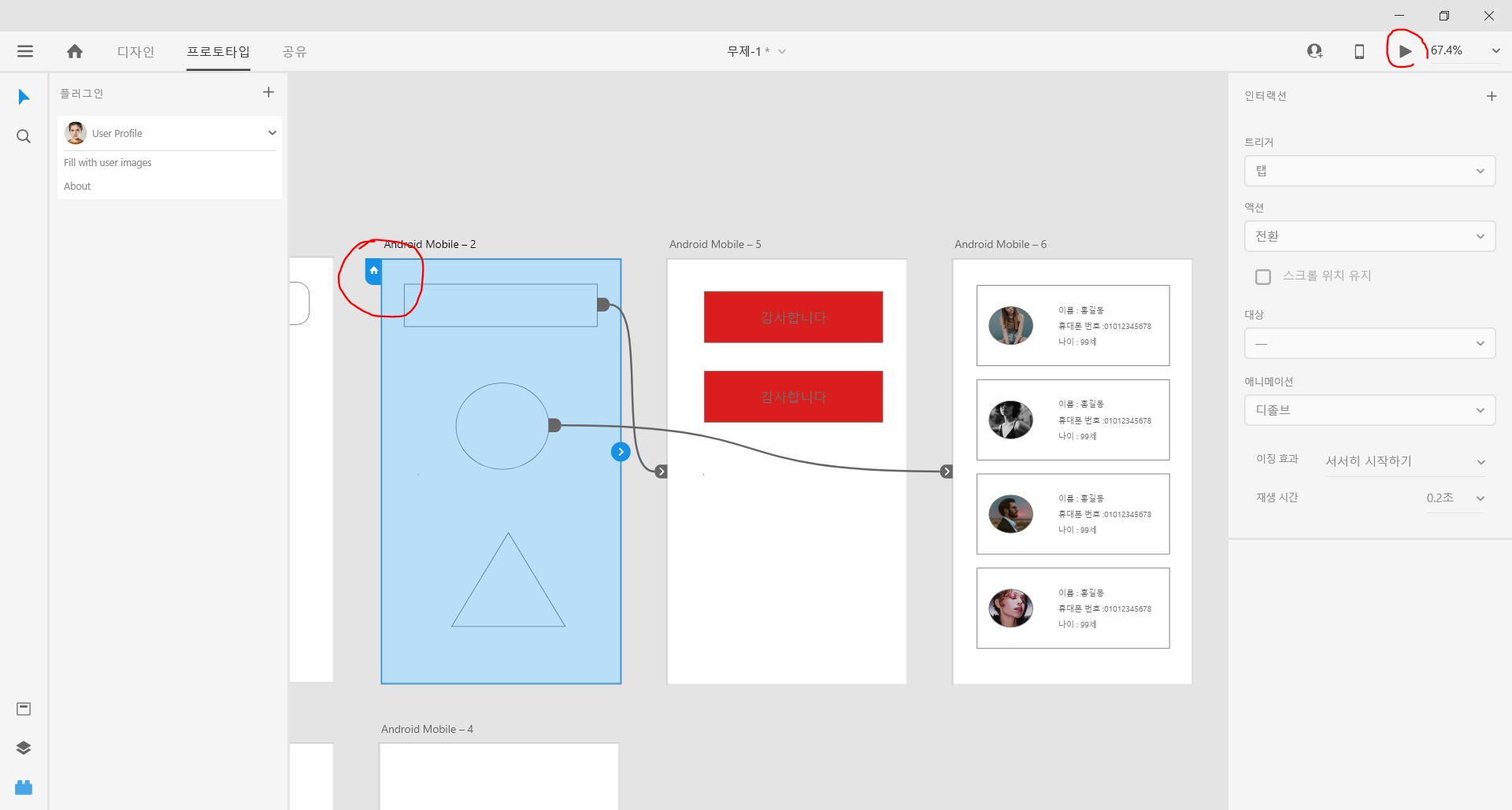 그리고 왼쪽 아래에 플러그인 버튼을 눌려서 Xd에서 제공하는 플러그인 을 사용할 수 있다. 나는 User Profile 이라는 플러그인을 이용해서 사람 이미지를 채워 넣었다.