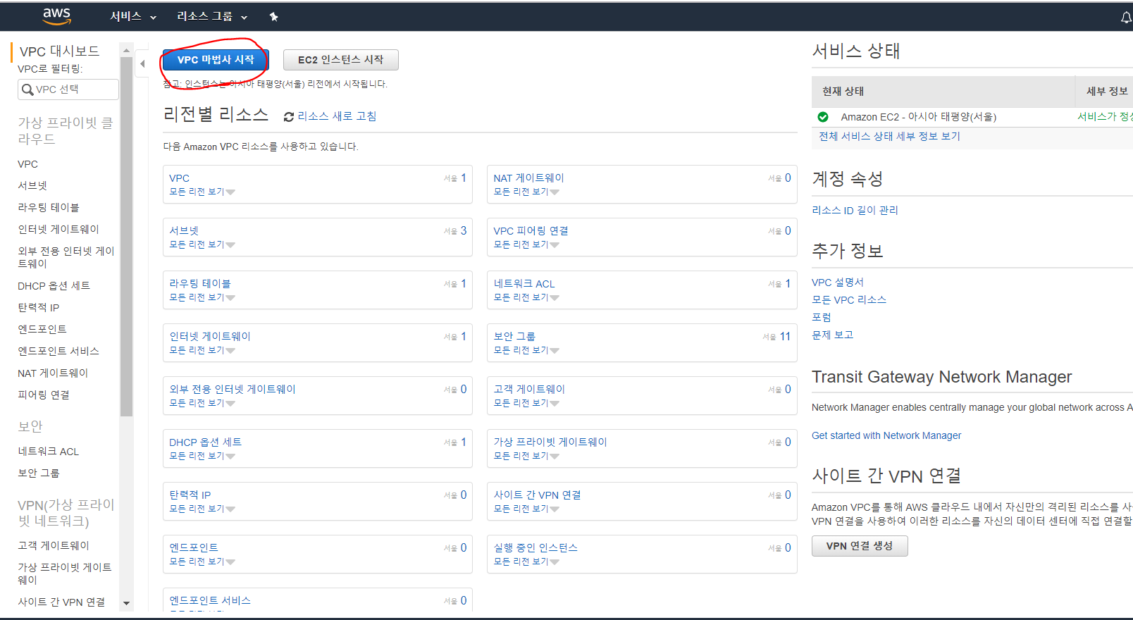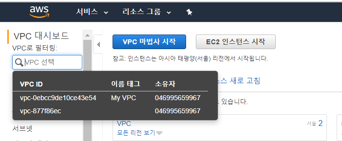 닫기 버튼을 누르고 VPC 대시보드를 클릭하면 아래와 같은 페이지가 나온다.