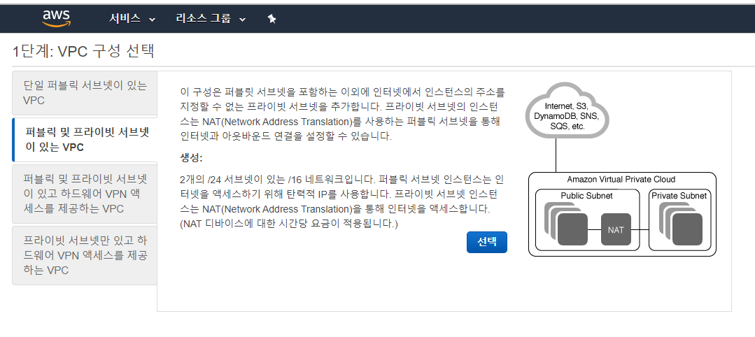 이렇게 네가지의 VPC를 구성할 수 있는데, 나는 퍼블릭 및 프라이빗 서브넷이 있는 VPC 를 만들거다. 웹서버를 퍼블릭 서브넷에 두고 DB 서버는 프라이빗 서브넷에 둘꺼다. 각자 목적에 맞게 구성을 선택하자.