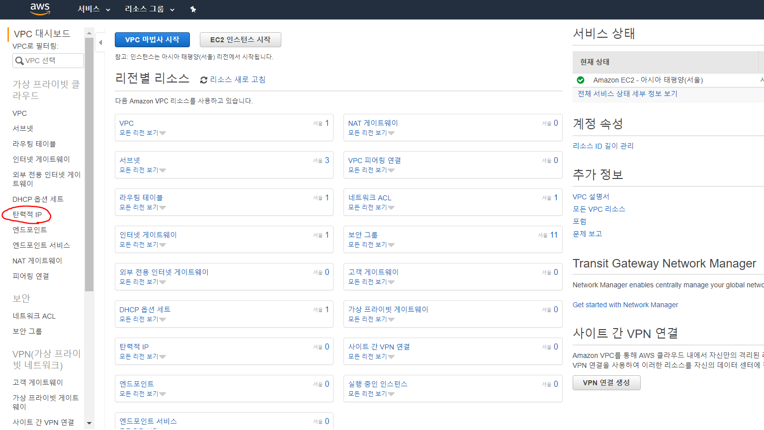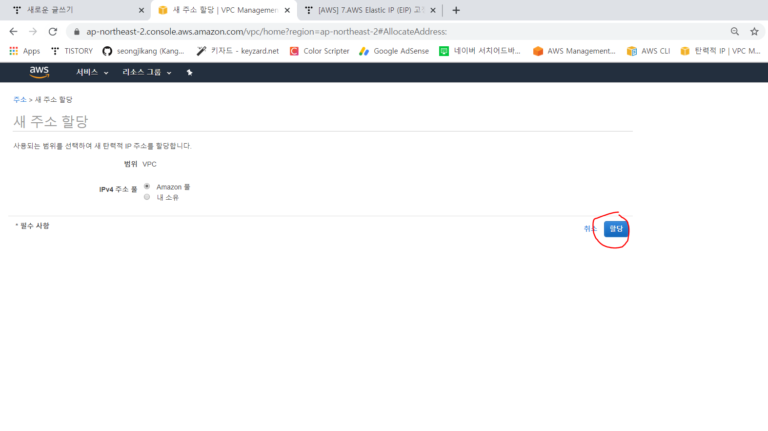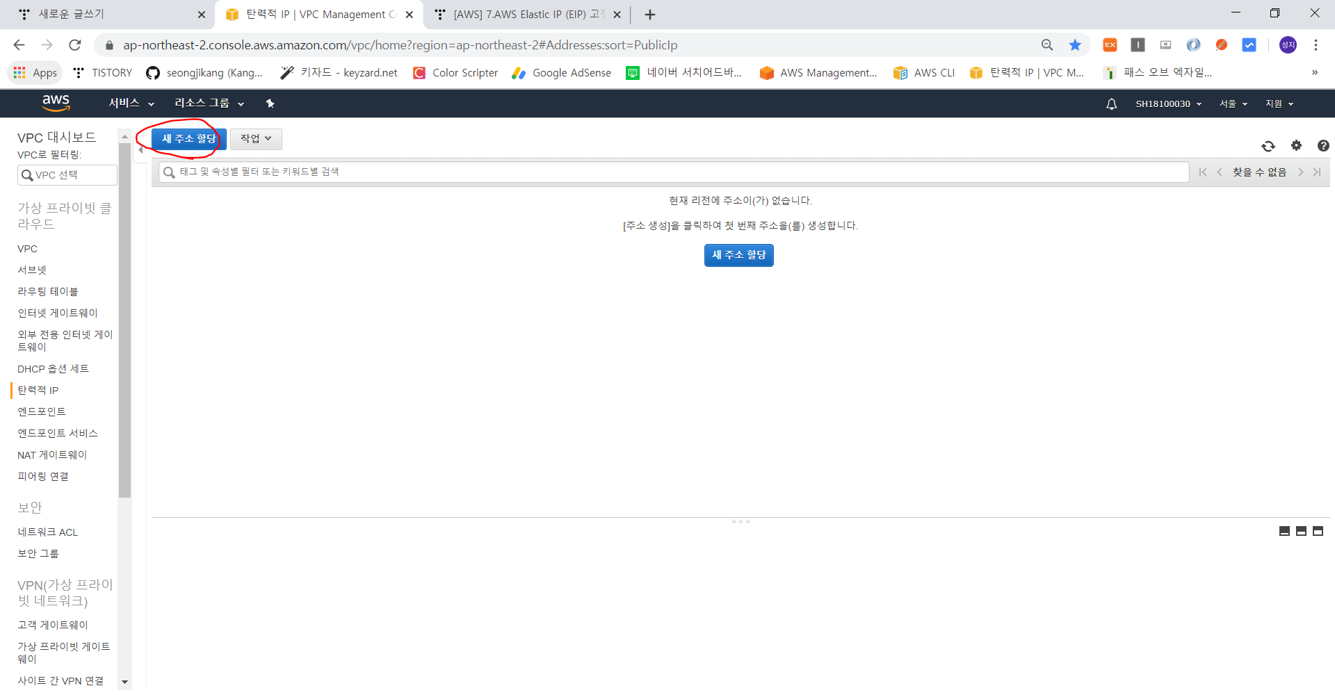 아.. !! 먼저 vpc 설정해주기 전에 Elastic IP (탄력적 IP) 를 하나 받자. vpc 안에는 EC2 인스턴스가 들어가는데 이 인스턴스의 IP는 유동적인 IP 주소가 할당된다. 그래서 우리는 이 인스턴스들에 접근하기 위해 고정된 IP 가 필요한데 그게 바로 Elastic IP 이다.