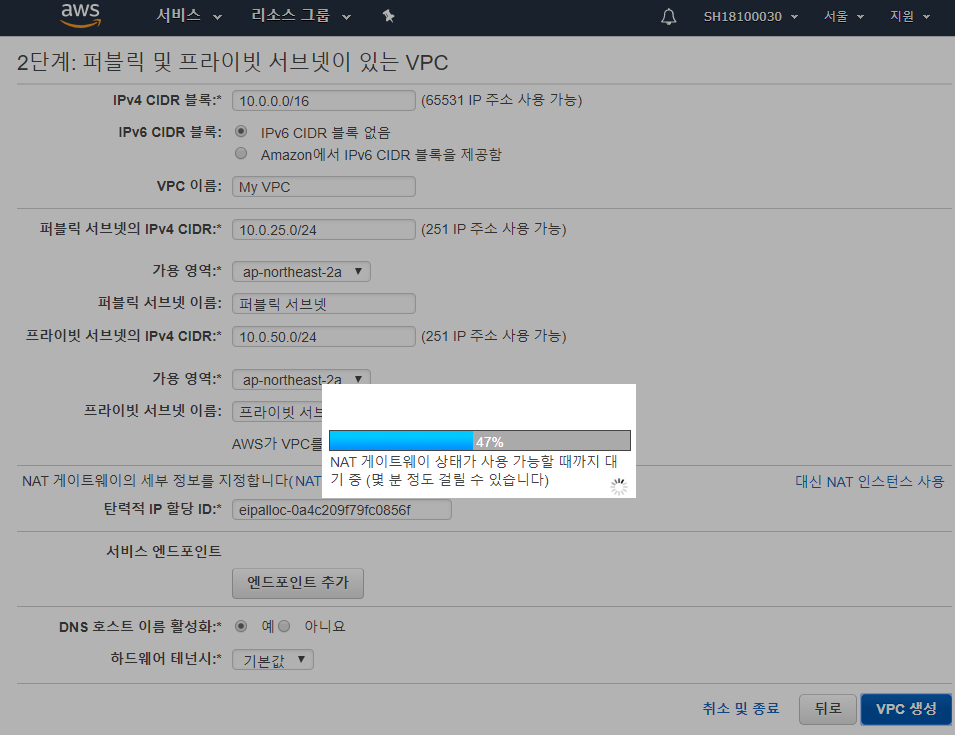 그리고 각 서브넷의 가용영역은 같은걸 선택해주자. 마지막으로 탄력적 ip 할당 ID는 입력창을 클릭하면 위에서 발급받은 탄력적 IP의 ID 값을 가져올 수 있다. 이렇게 설정해주고 vpc 생성을 클릭해주자 !