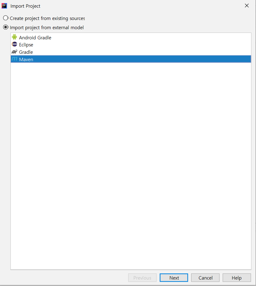 Import 할 방식을 선택해주자. 우리는 Maven~~