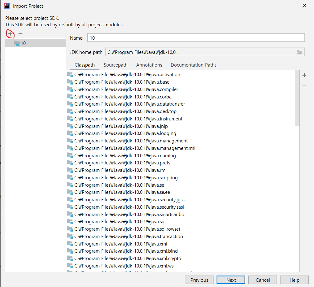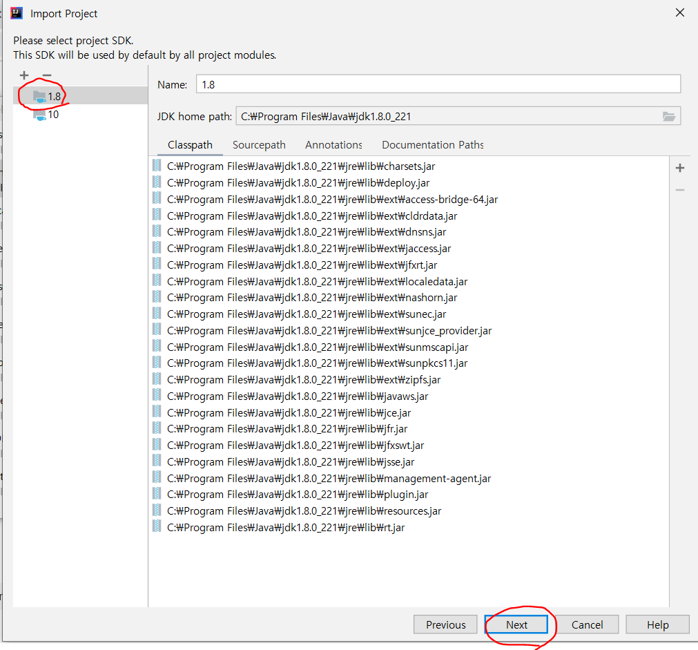 자 다음은 SDK 를 선택하는 부분인데, 내 pc에 java 버전을 기준으로 하나 만약 SDK 가 있다면 다른걸 선택할 수도 있다.