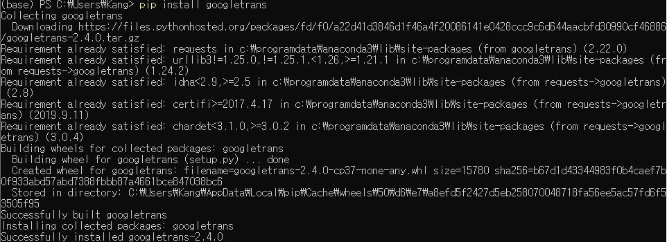 이렇게 잘 설치되는 걸 볼 수 있을 것이다. mac환경이시면 terminal에서 바로 해주면되고, 혹시나 파이썬을 따로 설치하신분들은 파이썬 설치 된 디렉토리가보면 pip 라는 스크립트 파일이 있으니 이 파일을 환경변수에 잘 적용해서 cmd창에서 pip 명령어를 쓰시면 된다.