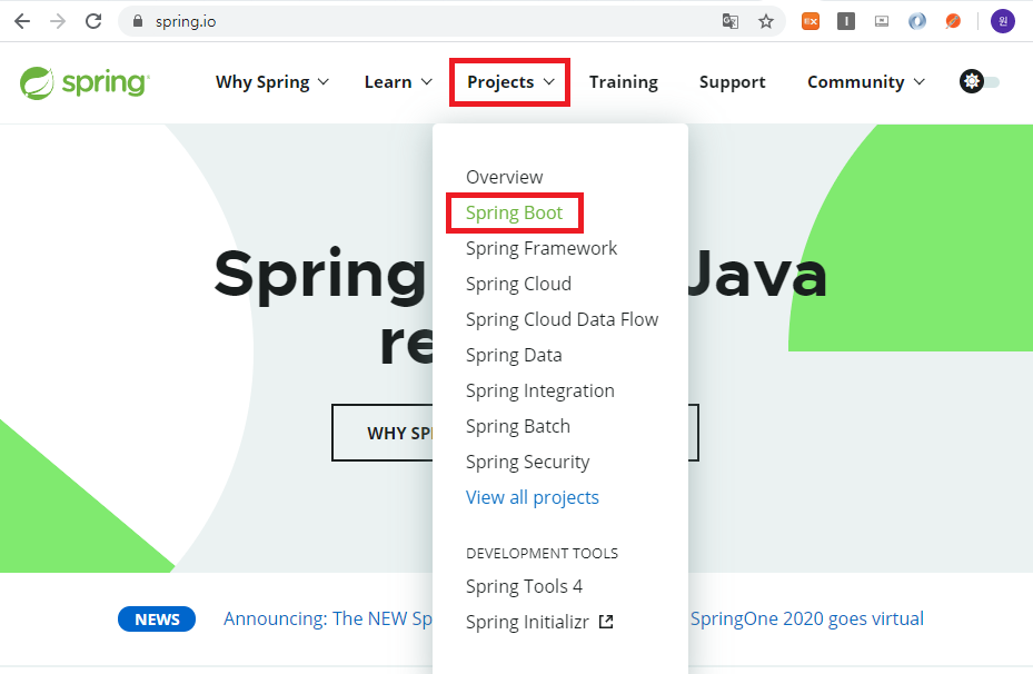들어가서 Projects > Spring Boot 를 눌려보자!