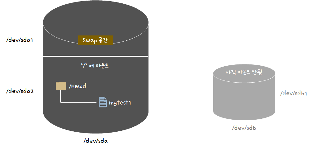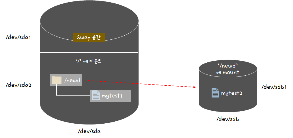 /newd 디렉토리는 이제 /dev/sda2 가아니라 /dev/sdb1 에 있게된다. 그리고 /dev/sda2 에 있던 mytest1 파일은 삭제가 되는게 아니라 /newd 가 /dev/sdb1 에 마운트 됐기 때문에 잠시 숨어 있는 것이다.