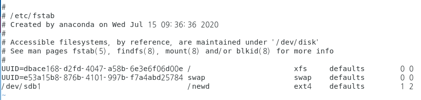 먼저 /etc/fstab를 vi를 이용해서 열자.