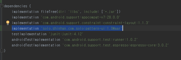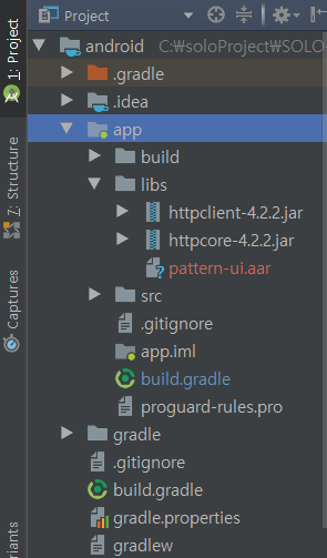 그림을 보면 libs 폴더안에 pattern-ui이라는 aar 파일이 있다. 해당 라이브러리는 패턴을 그리기 위해 사용하는 라이브러리로 내가 직접 만든 라이브러리이다.