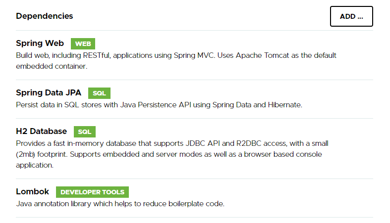 Spring Data JPA 는 필수적이다. 그리구 보통 Spring으로 RESTFul 서비스를 하니깐 Spring Web 설정도 필수적이다.