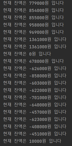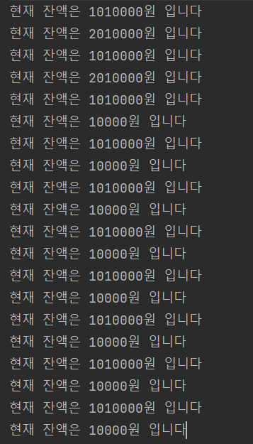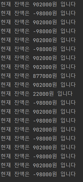 마지막으로 위의 코드는 각 출금과 입금 스레드를 10번씩 수행 시킨다.