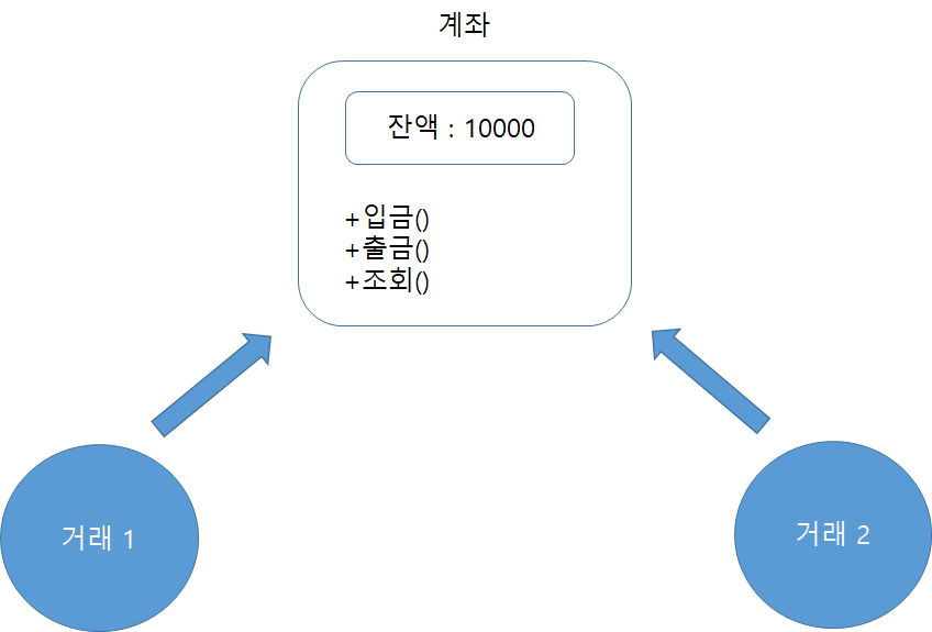 위의 그림에 표현된 계좌에는 동시 다발적으로 입금, 출금 ,조회가 일어난다. 그런데 여기서 문제가 하나 보인다. 바로 저 거래1과 2라는 스레드가 동일한 잔액이라는 데이터를 건드린다는 것이다.