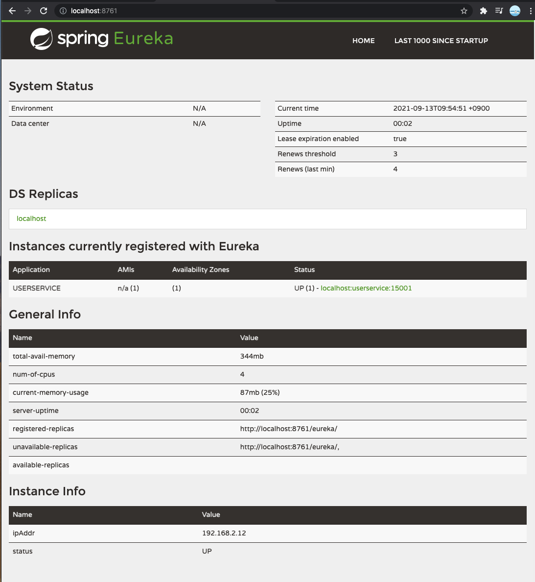 그리고 Eureka Server 에 접속을 해보면 MSA Service 가 등록되어 있는 것을 볼 수 있다.
