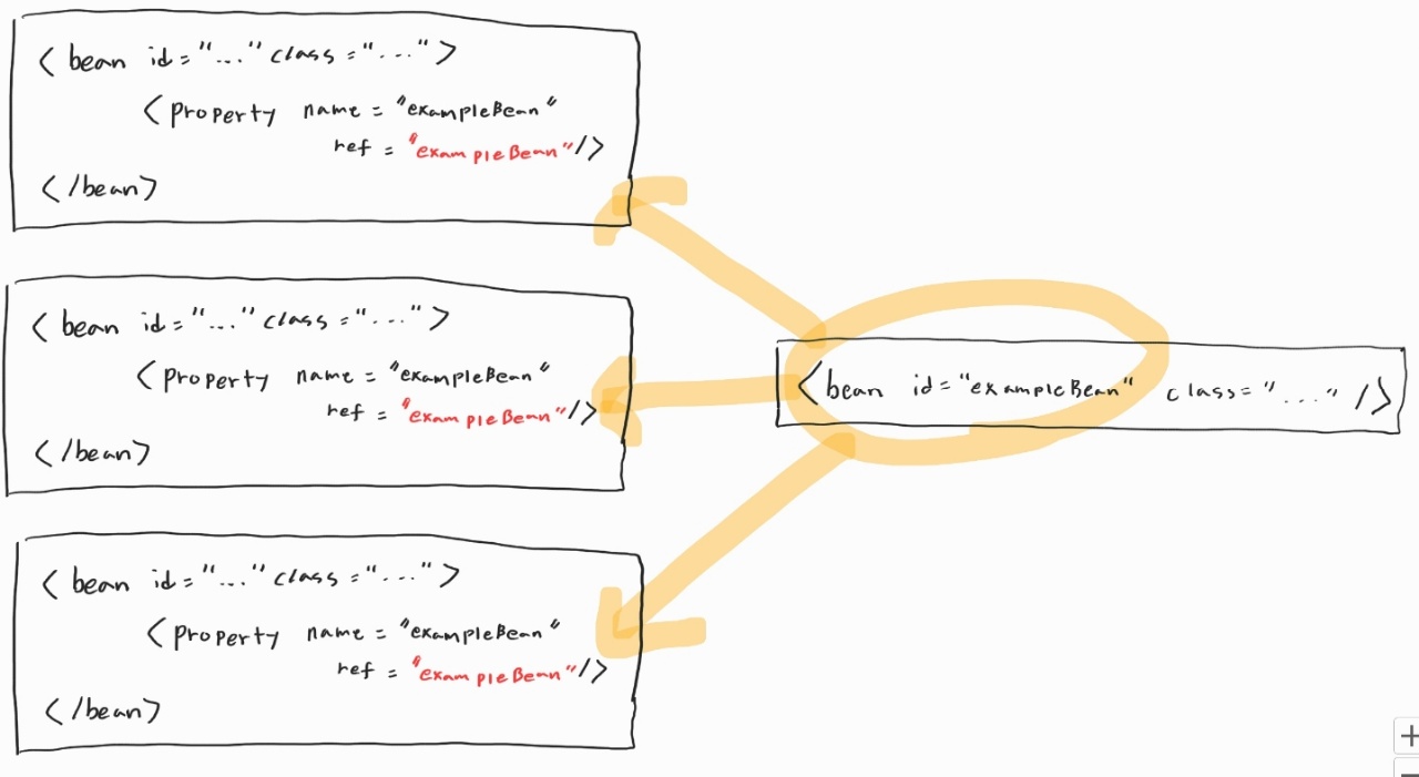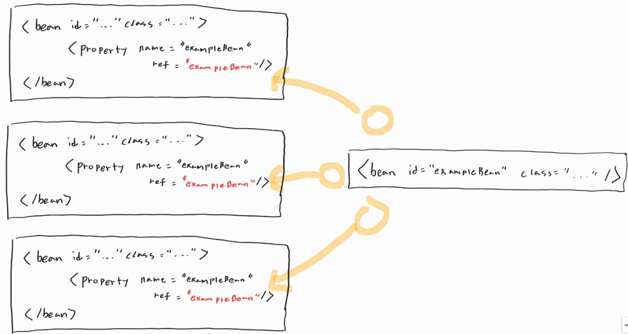 생성된 하나의 인스턴스는 single beans cache에 저장되고 이 빈에 요청이나 참조가 있으면 캐시에서 객체를 반환한다. 각 요청과 참조는 동일한 빈에 대한 것이다. 만약 여러분이 scope를 따로 명시하지 않으면 이 singleton 으로 설정된다.