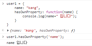 실제로 hasOwnProperty (해당 키가 객체의 프로퍼티인지 아닌지 체크해주는 기능을 수행) 라는 것을 써보면 위처럼 true, false 로 결과가 잘 리턴 되는 것을 볼 수 있다.