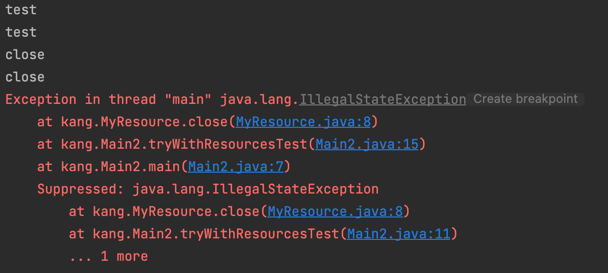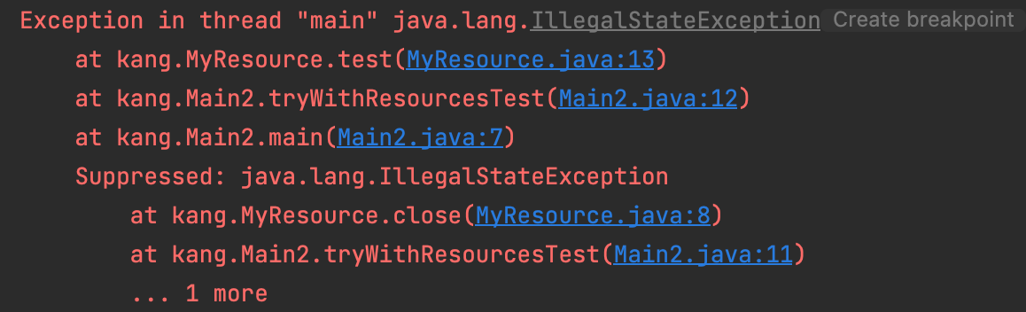 아까전에 내가 try-with-resources 방법을 통해 스택트레이스 추적이 용이해진다고 했는데 조금 더 알아보기 위해 아래 예시를 작성하였다.