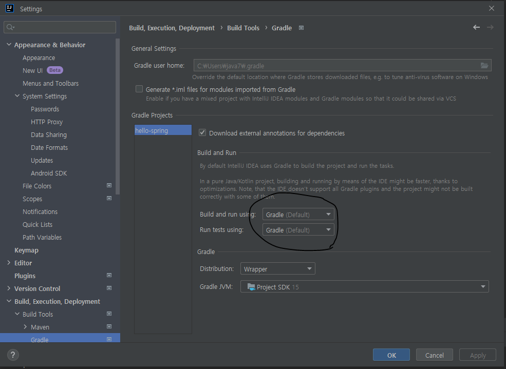 File (맥 환경에서는 Preferences..) > Build, Execution, Deployment > Build Tools > Gradle 로 가면