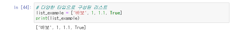 리스트는 java 처럼 한 타입만 허용하는 건 아니다. 다양한 타입의 데이터를 한 리스트에 넣을수 있다( 개꿀~)