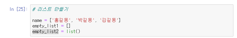 리스트는 데이터를 채워서 만들 수도 있고, 비어있는 대괄호 쌍을 이용하거나 list 함수를 사용해서 빈 리스트를 만들 수도 있다.