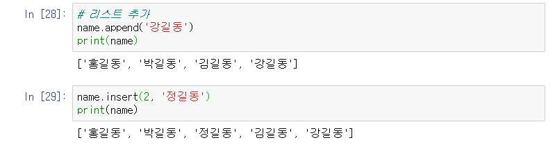 append 함수를 이용하면 맨 뒤에 데이터가 추가되고 insert의 경우 원하는 위치에 데이터를 추가할 수 있다.