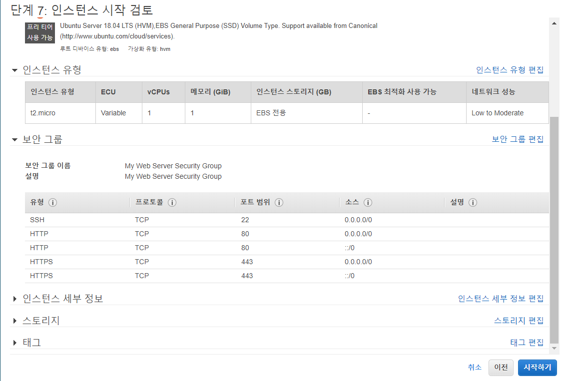 이렇게 된 화면이 보일거다. 웹서버 처럼 사용해야하니깐 그에 맞게 보안그룹을 설정해주자.