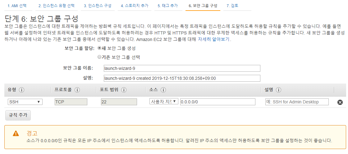 음 일단 학습을 위해 만드는 거니깐, SSH, HTTP, HTTPS 모두 Any로 해주자. 나중에도 변경이 가능하다.