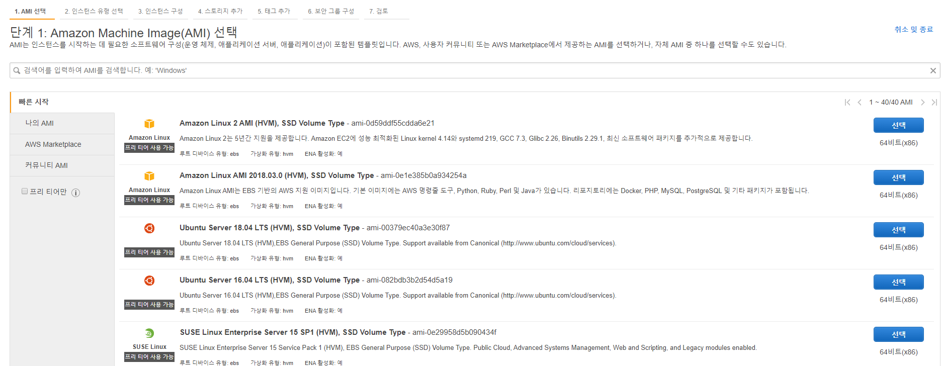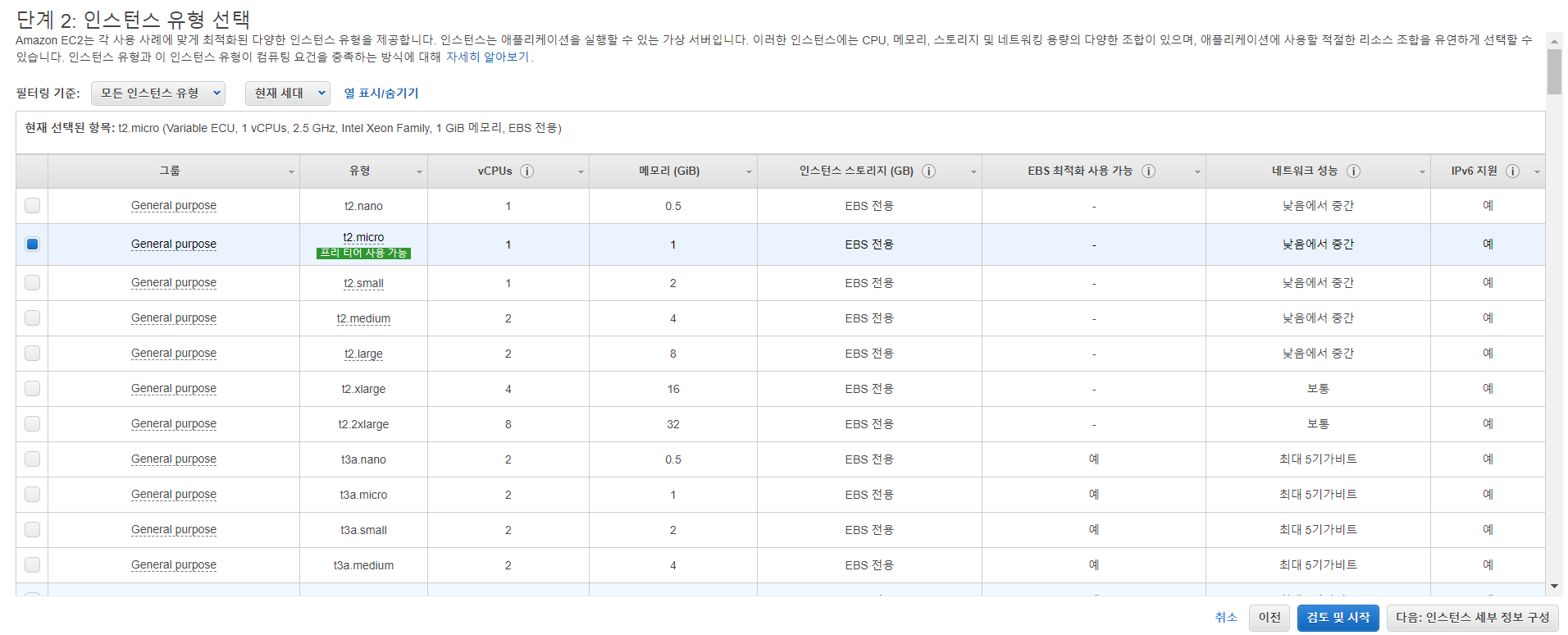 다음은 os의 성능을 선택할 수 있다. 나는 ... 무료인 프리티어를 사용하고 있으므로 프리티어가 가능한 버전을 선택하도록 하겠다. 여기서 검토 및 시작을 누르지말고 다음: 인스턴스 세부 정보 구성을 누르자. 왜냐면 ... 그냥 해버리면 default로 설정된 값들로 인스턴스가 만들어진다. 우리가 저번 포스팅에 공부했던 VPC도 다음단계에서 설정해줘야 한다.