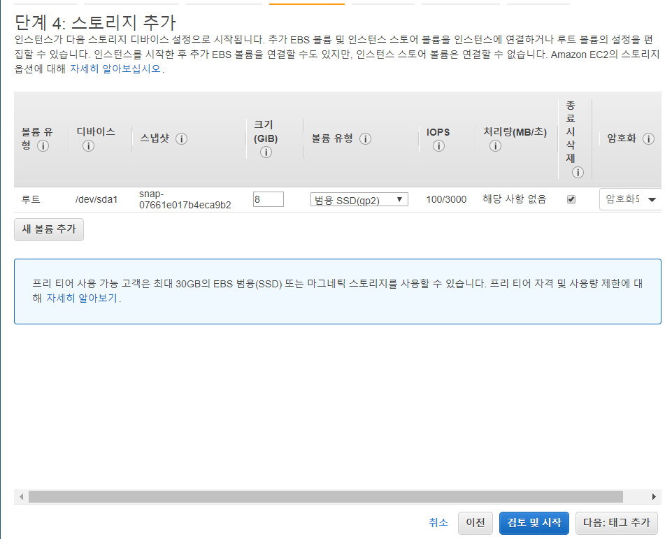 내가 만들 인스턴스의 스토리지를 설정해주는 부분이다. 필요한 만큼 설정하자. 그리고 다음:태크 추가를 눌러보자.