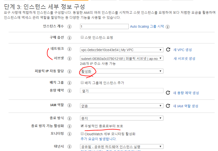 VPC와 서브넷을 선택해주고, 퍼블릭 IP 도 할당해주자. 그리고 모르고 인스턴스를 날려버리는 것도 방지해주자. (우발적인 종료로부터 보호 체크 해주면 된다.)