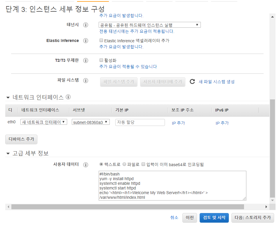 그리고 스크롤 내려보면... 고급 세부정보에 사용자 데이터를 입력하는 부분이 나오는데 이부분은 이 인스턴스가 시작될때 돌아가는 스크립트를 작성하는 부분이다. 안해도 되지만 나는 왠만하면 해주는 편이다.