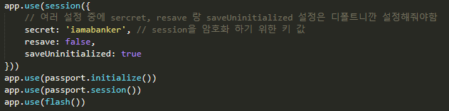 passport 모듈 이외에 몇가지를 더 설치해줬다. 간단하게 말하자면 세션 처리를 로컬 디비에서 할 수 있게 도와주는 passport-local, 세션 처리를 할 수 있게해주는 express-session, 에러메시지 같은 걸 redirect 과정에서 쉽게 전달할 수 있게 해주는 connect-flash 를 설치했다 ㅎㅎ