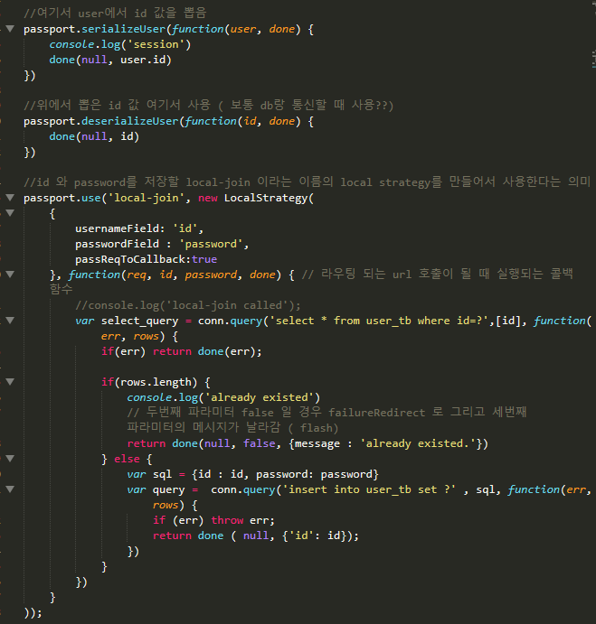 먼저 passport.use('local-join', new LocalStrategy ( ~~~~ 는 id 와 password를 저장할 local-join이라는 이름의 local strategy를 만들어 사용하는 코드이다. url 호출 시 동작하는 콜백 함수가 있는데 여기서 쿼리를 처리해주면 된다.