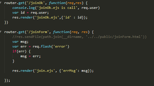 굉장히 코드가 쉽다. /joinOk에서는 session에서 뽑아온 id 값을 이용해 joinOk.ejs 파일을 불러오고, /joinForm 에서는 저장한 에러 메시지를 이용해 join.ejs 파일을 불러온다.