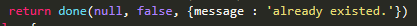 이렇게 리턴을 하고 있다. 성공했을때는 세션 값으로 id 값을 보내고 실패한 경우는 메시지를 보내고 있다. 그리고 실패한 경우는 두번째 파라미터에 false 값이 들어가는 것도 확인할 수있다.