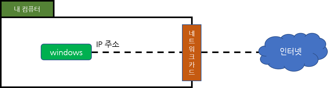 위의 그림은 아주 간단하다. 나는 Windows 운영체제를 가진 컴퓨터를 사용하기 때문에 내컴퓨터를 기준으로 설명하겠다. 보통 우리가 인터넷이랑 pc를 연결하려면 네트워크 카드가 필요하다. 인터넷을 연결해줄 랜선을 컴퓨터에 끼우면 내 ip 주소랑 인터넷을 연결해준다. 일반적인 PC는 위와 같다.