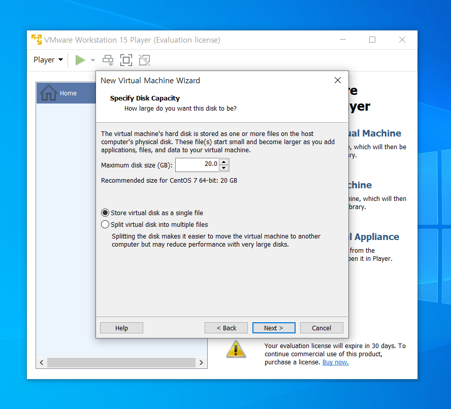 다음은 디스크의 크기를 정해주자. 그리고 아래 Single file로 디스크를 저장할지 Multiple files로 디스크를 저장할지 물어본다. 전자는 하나의 파일로 후자는 여러개로 파일을 쪼개서 관리한다는 뜻이다. 본인의 입맛대로 선택하자.